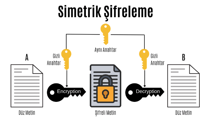 Simetrik Şifreleme, hem düz metni şifrelemek hem de şifreli metnin şifresini çözmek için kullanılan bir şifreleme türüdür. Yani, Gizli anahtar, veriyi hem şifrelemek hem de şifresini çözmek için gerekli olacak olanla aynıdır.